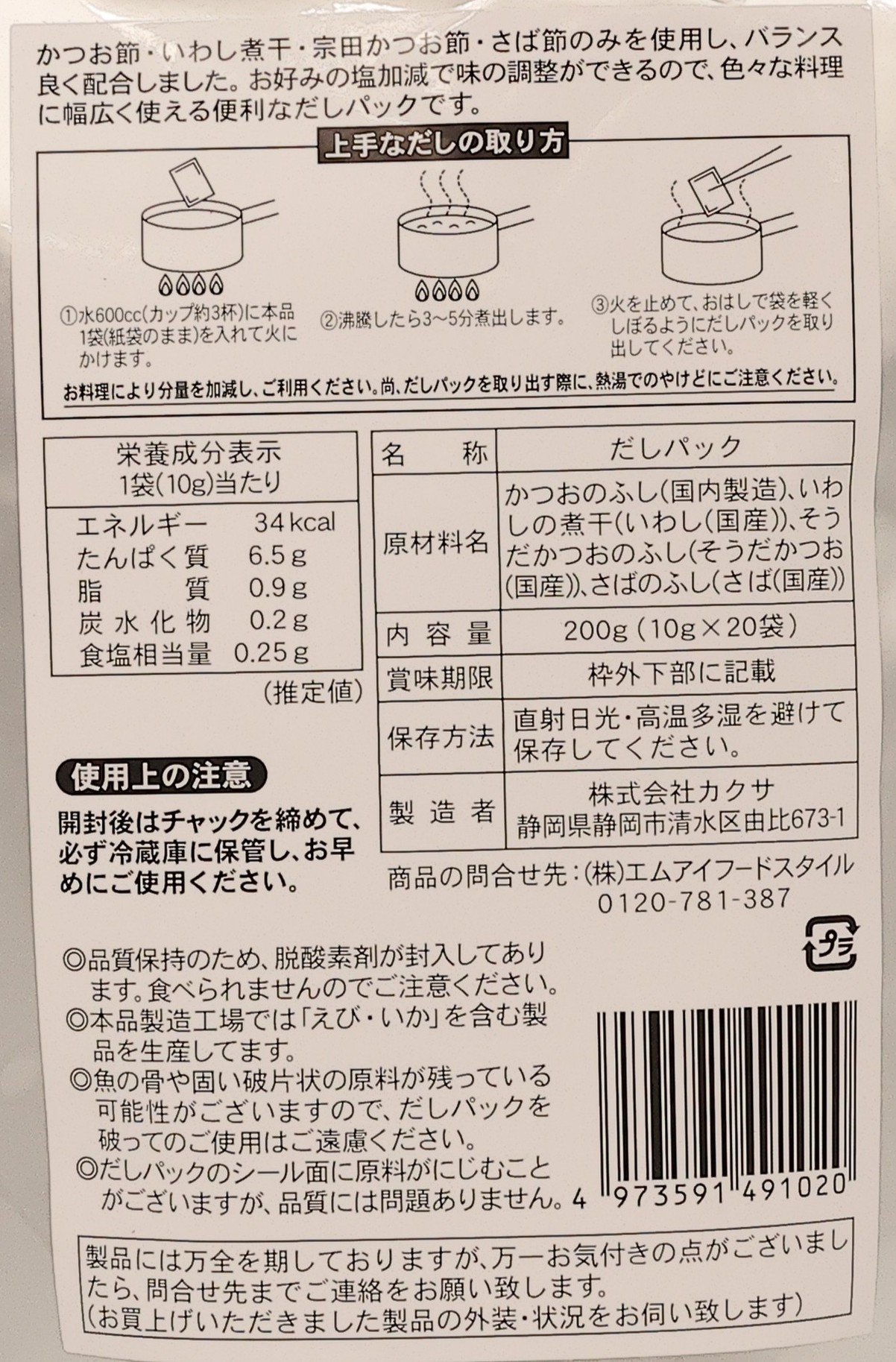 原材料名:かつおのふし(国内製造)、いわしの煮干(いわし(国産))、そうだかつおのふし(そうだかつお(国産))、さばのふし(さば(国産))
