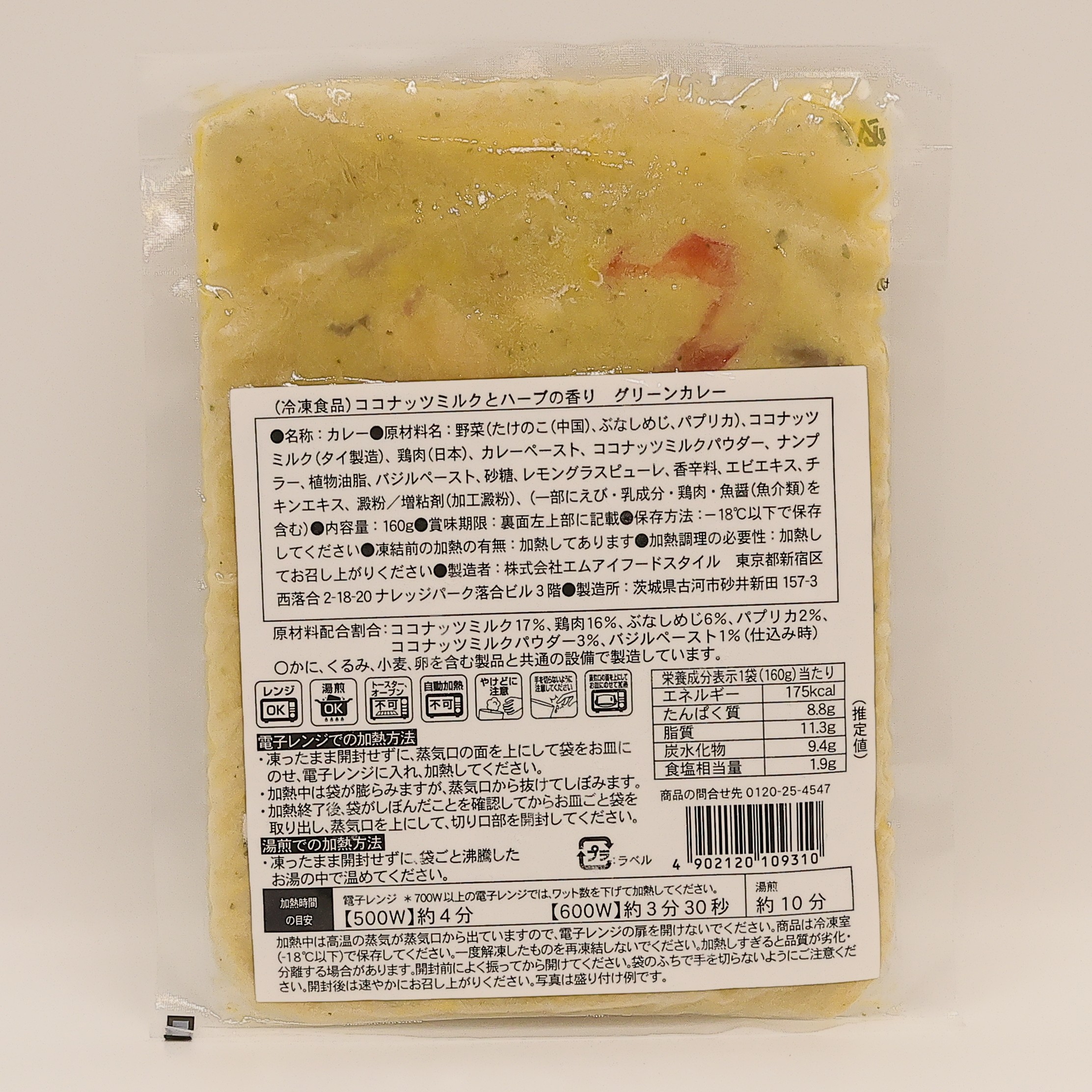原材料名:野菜(たけのこ(中国)、ぶなしめじ、パプリカ)、ココナッツミルク(タイ製造)、鶏肉(日本)、カレーペースト、ココナッツミルクパウダー、ナンプラー、植物油脂、バジルペースト、砂糖、レモングラスピューレ、香辛料、エビエキス、チキンエキス、澱粉/増粘剤(加工澱粉)、(一部にえび・乳成分・鶏肉・魚醤(魚介類)を含む)