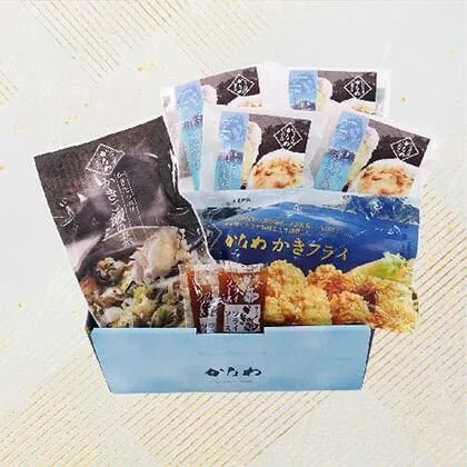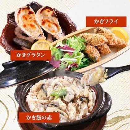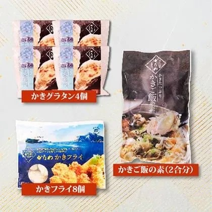 かきご飯の素、かきグラタン4個、かきフライ8粒Lサイズ、フライソースミニ袋×2