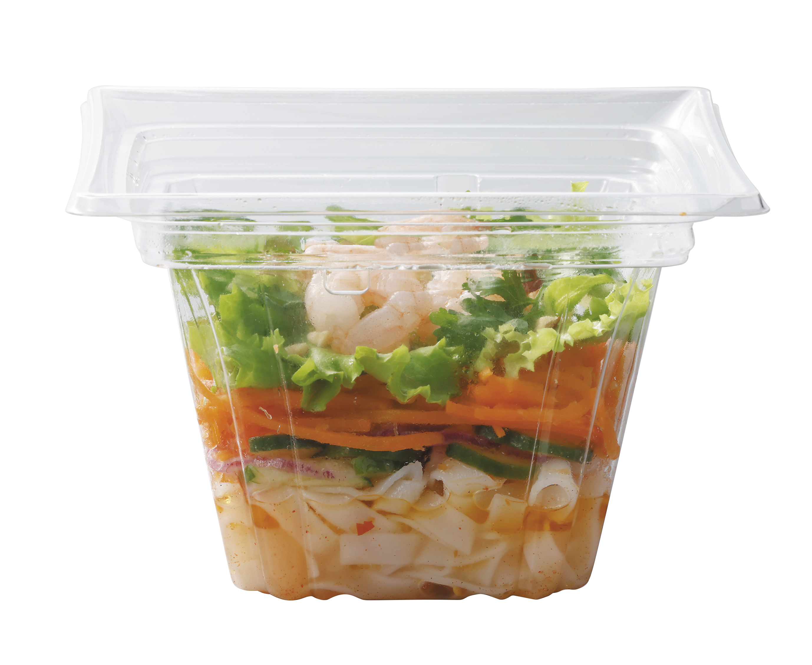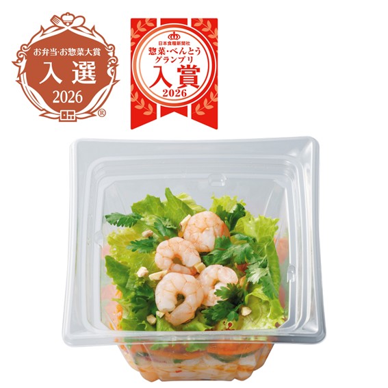 原材料:ライスヌードル(ベトナム製造)、にんじん、スイートチリソース、ボイルむきえび、きゅうり、たまねぎ、りんご酢、植物油脂、リーフレタス、砂糖、レモンジュース、アーモンド、魚醤調味料、パクチー、おろしにんにく、でんぷん、食塩、カイエンペッパー、胡椒/pH調整剤、増粘剤(キサンタン)、漂白剤(亜硫酸塩)、(一部にえび・アーモンド・鶏肉・りんごを含む)