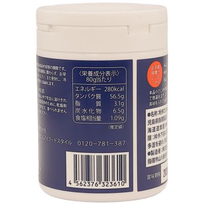 栄養成分表示80g当たり:エネルギー280kcal、タンパク質56.5g、脂質3.1g、炭水化物6.5g、食塩相当量1.09g