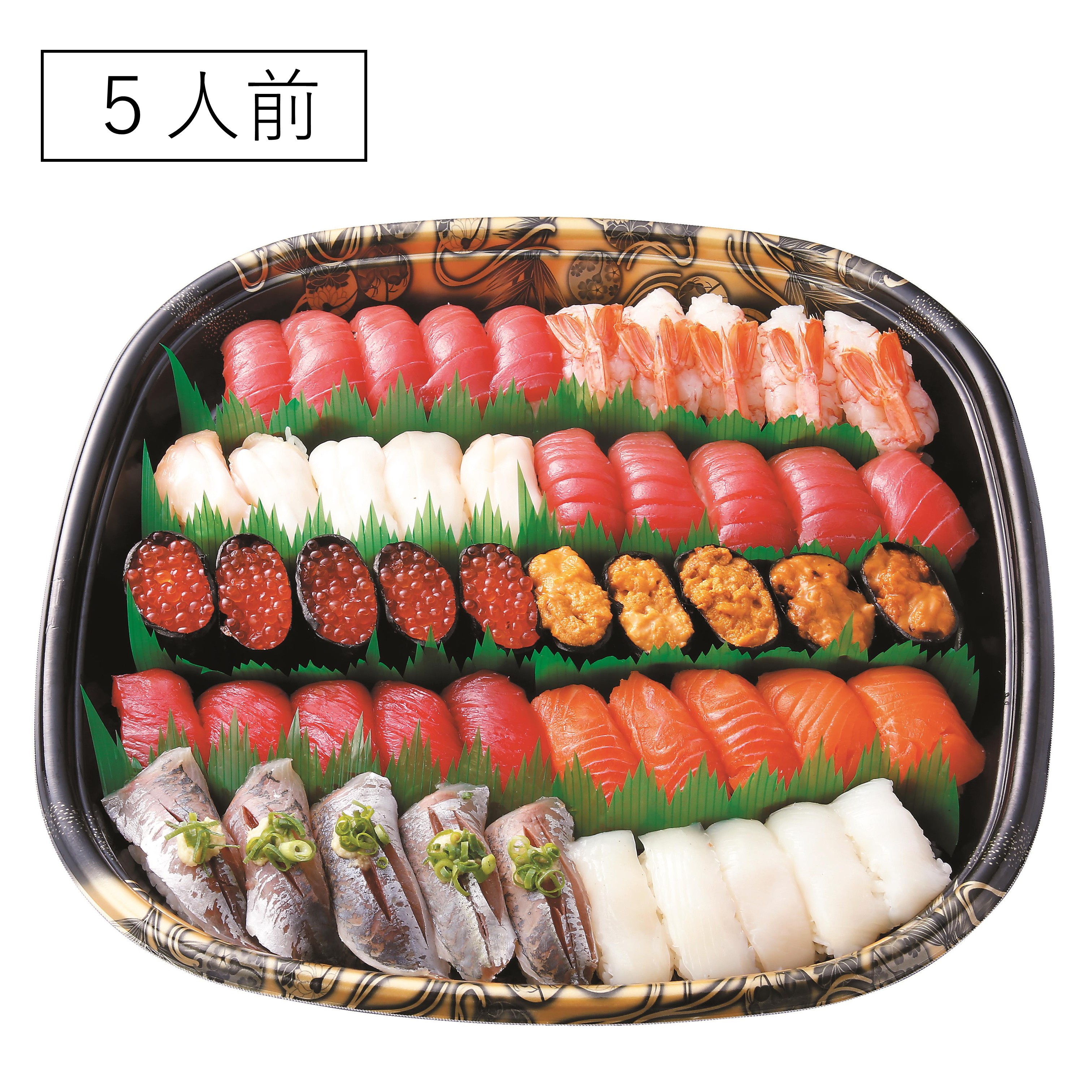 内容量:1パック【2人前・20貫】本まぐろ中トロ4貫、本まぐろ赤身2貫、赤海老2貫、つぶ貝2貫、あじ2貫、いくら醤油漬け2貫、うに2貫、サーモン2貫、いか2貫【3人前・30貫】本まぐろ中トロ6貫、本まぐろ赤身3貫、赤海老3貫、つぶ貝3貫、あじ3貫、いくら醤油漬け3貫、うに3貫、サーモン3貫、いか3貫【4人前・40貫】本まぐろ中トロ8貫、本まぐろ赤身4貫、赤海老4貫、つぶ貝4貫、あじ4貫、いくら醤油漬け4貫、うに4貫、サーモン4貫、いか4貫【5人前・50貫】本まぐろ中トロ10貫、本まぐろ赤身5貫、赤海老5貫、つぶ貝5貫、あじ5貫、いくら醤油漬け5貫、うに5貫、サーモン5貫、いか5貫