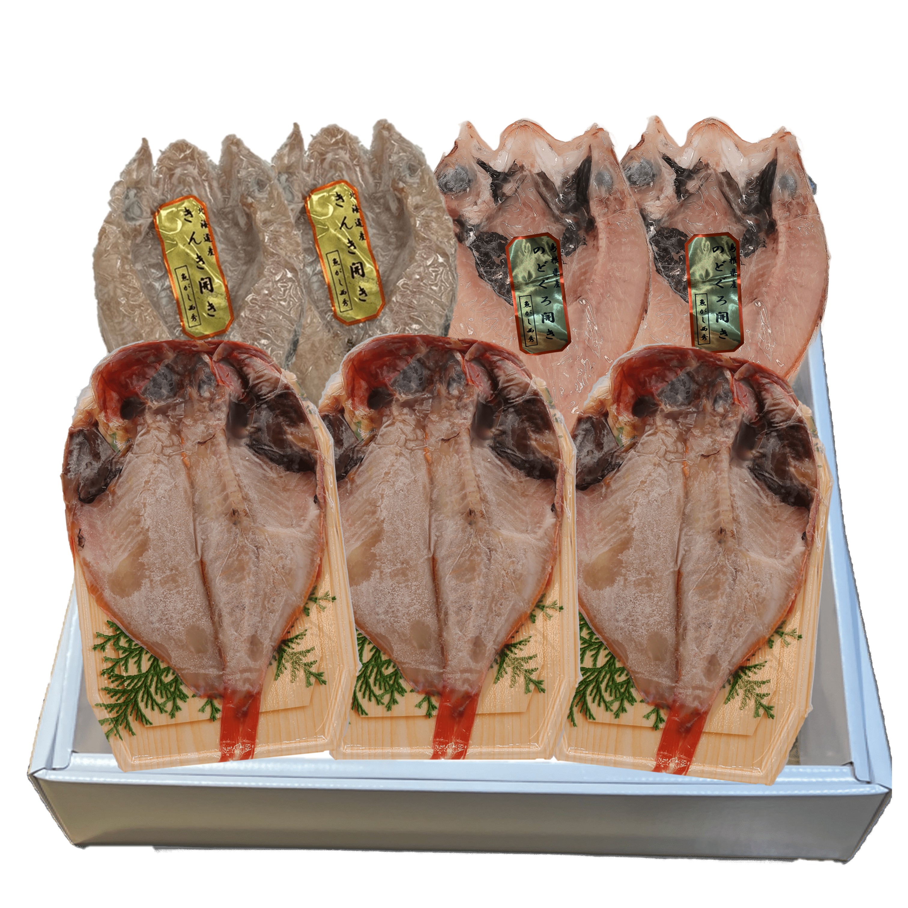 内容量:【西秀商店の干物】きんき開き×2、のどぐろ開き×2、金目鯛開き板パック×3