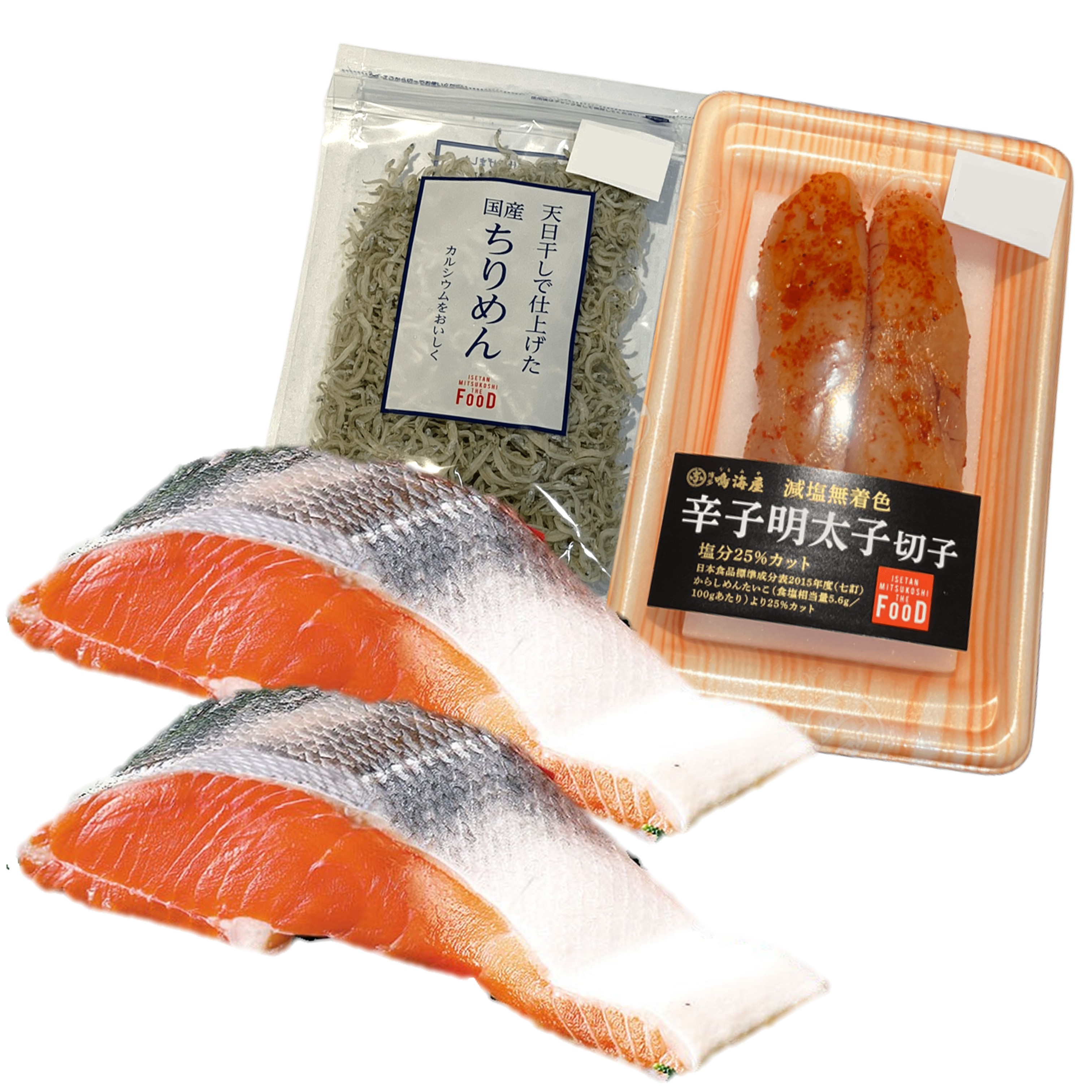 内容量:厚切り銀鮭×2、THEFOODちりめん×1、THEFOOD明太子×1